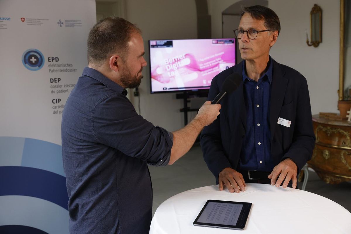 Dans la salle des fêtes du Erlacherhof à Berne, Adrian Schmid, responsable du secrétariat d’eHealth Suisse, a répondu aux questions posées par la personne chargée de l’animation. « L’introduction du dossier électronique du patient est un projet intergénérationnel, » a-t-il souligné. « Le changement culturel prendra un certain temps. »